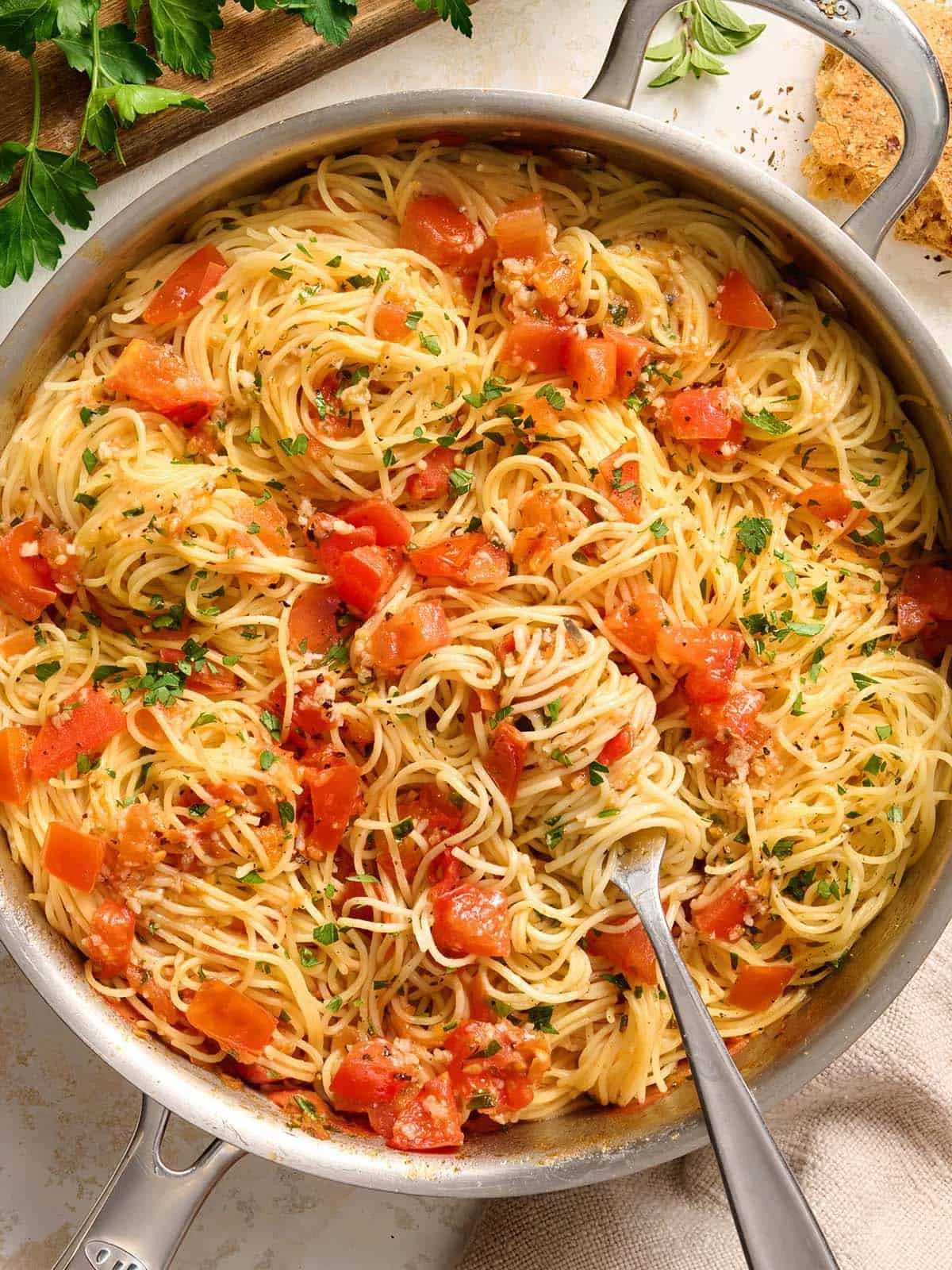 Rice emphasizes that the "freshness" of the pomodoro sauce is a departure from the heavy, long-simmered marinara sauces often found in jarred varieties. The quick-sauté method preserves the "bright" and "vibrant" notes of the tomato, which are often lost during high-heat commercial canning processes. From a technical standpoint, the reservation of a half-cup of pasta cooking water—a liquid rich in released starches—is a critical step. This starchy water acts as an emulsifier, binding the olive oil and tomato juices to the fine strands of the angel hair, ensuring a cohesive texture without the need for dairy-based thickeners.