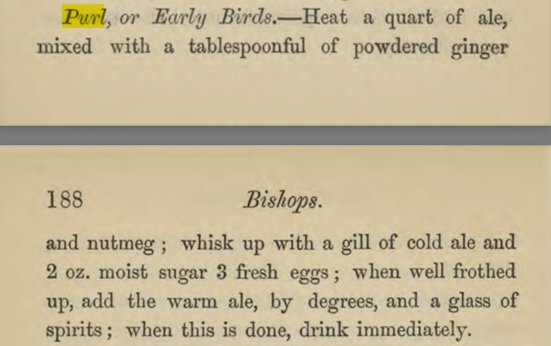 - 1869: William Terrington’s Cooling Cups and Dainty Drinks documents the Purl as a complex, heated egg flip with variable spirits.