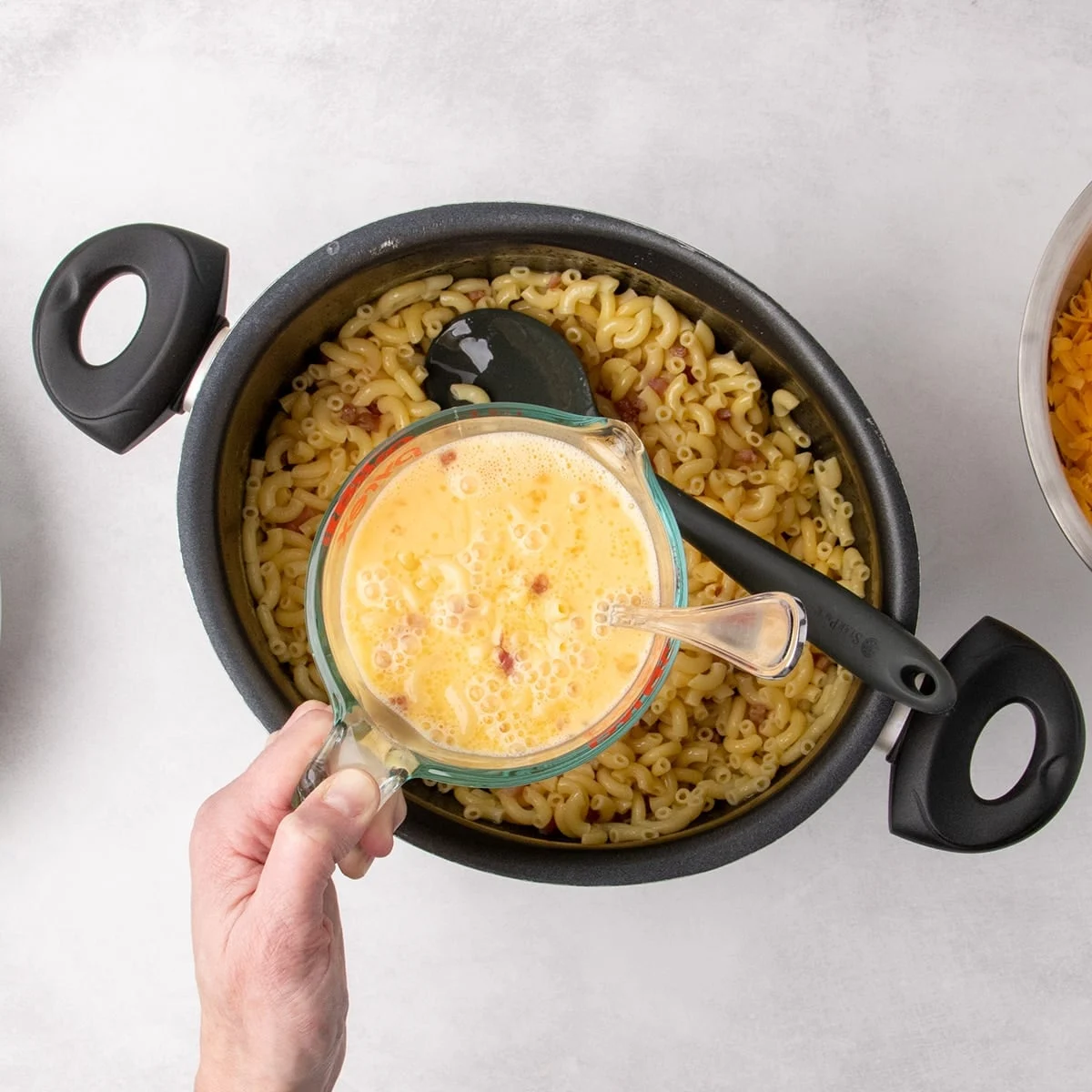 Pour the tempered egg and milk mixture over the pasta and pork. Gently fold everything together. The goal is to evenly distribute the custard without breaking the pasta.